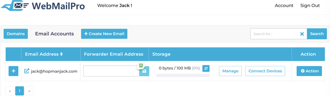 Within WebMailPro, your linked Domains from SendEagle, Rapify, WPGateway, or InstantReply will be visible. To create your own Email Address with these Domains, simply click on the Plus Sign.